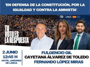 Y ha vuelto a animar a todos los lorquinos a asistir al acto del próximo domingo pero, sobre todo, a que vayan a votar el 9 de junio. «Solo movilizándonos, siendo conscientes de la importancia de estas elecciones y votando masivamente en las urnas podemos enviar a Europa un mensaje en el que quede claro que desde España podemos acabar con todas estas políticas y con este Gobierno de Pedro Sánchez, ya que el Partido Popular es la única alternativa para defender la igualdad de los españoles y la democracia», ha concluido.