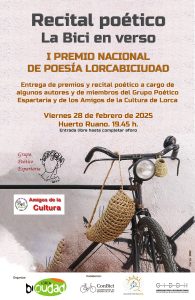 Este viernes 28 de febrero, en el Huerto Ruano y desde las 19,45 horas, LorcaBiciudad organiza la entrega del premio dotado con 500 € y accésit a los poemas más destacados del I CERTAMEN NACIONAL DE POESÍA LORCABICIUDAD, ofreciendo además un RECITAL con veinte de los poemas recibidos. Al acto ha sido invitado el Alcalde de Lorca, D. Fulgencio Gil y el Concejal de Cultura, D. Santiago Parra, que ha cedido el espacio del Huerto Ruano para la realización del acto. Colaboran con elevento la Coordinadora Estatal ConBici y darán lectura a algunos de los poemas miembros de los Amigos de la Cultura y del Grupo Poético Espartaria.