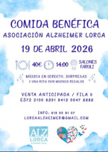 La Asociación Alzheimer y Otras Demencias Lorca realiza la XXII Comida Benéfica programada para el domingo 19 de abril de 2026, que tendrá lugar en salones El Faroli.